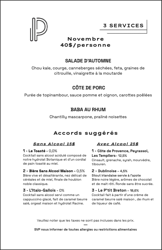 TABLE D’HÔTE NOVEMBRE – 40$/personne *Disponible du dimanche au mardi*