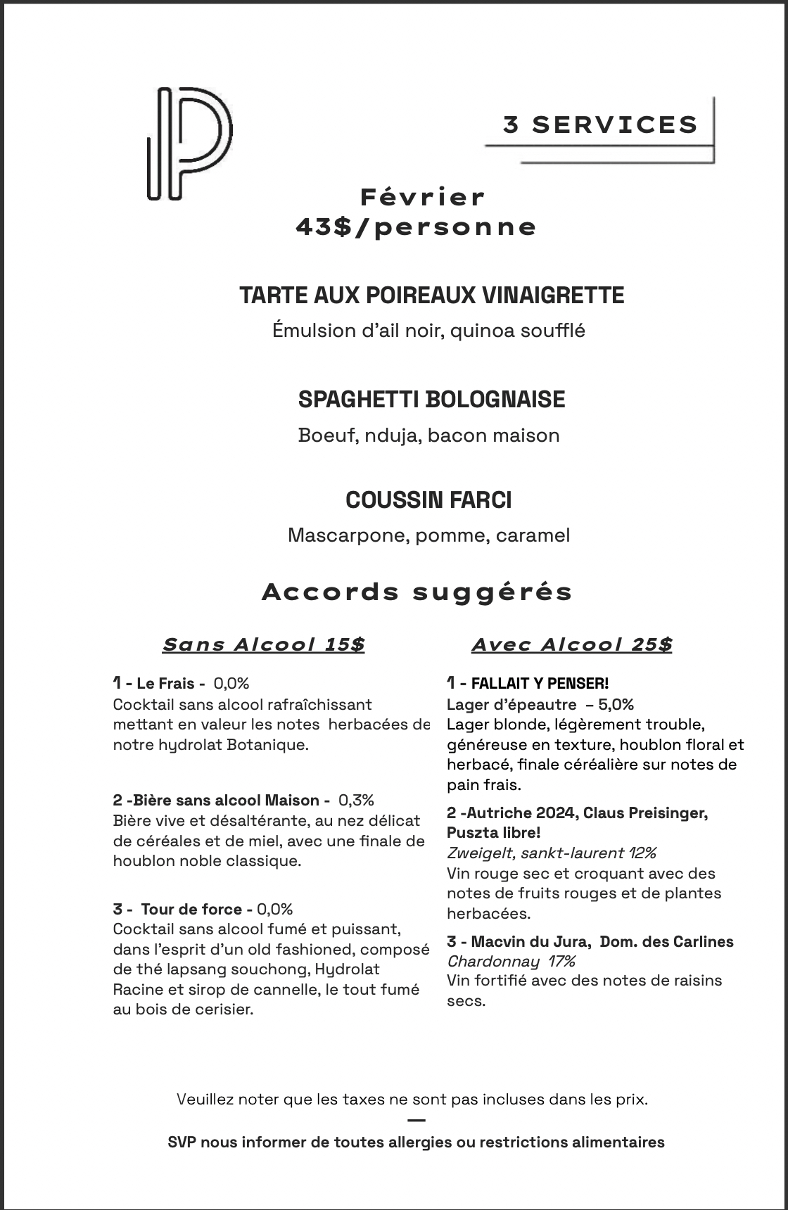 TABLE D’HÔTE FÉVRIER – 43$/personne *Disponible du dimanche au mardi*